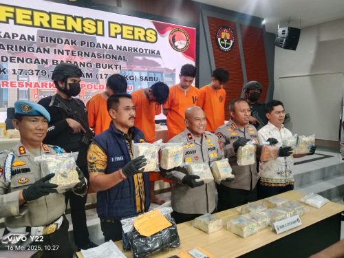 Pekanbaru, FaktaTV.com – Direktorat Reserse Narkoba Polda Riau berhasil menggagalkan penyelundupan narkotika jenis sabu seberat 17,37 kilogram dari jaringan internasional. Pengungkapan kasus ini dilakukan pada 12 Mei 2025 dan melibatkan penangkapan empat tersangka.
